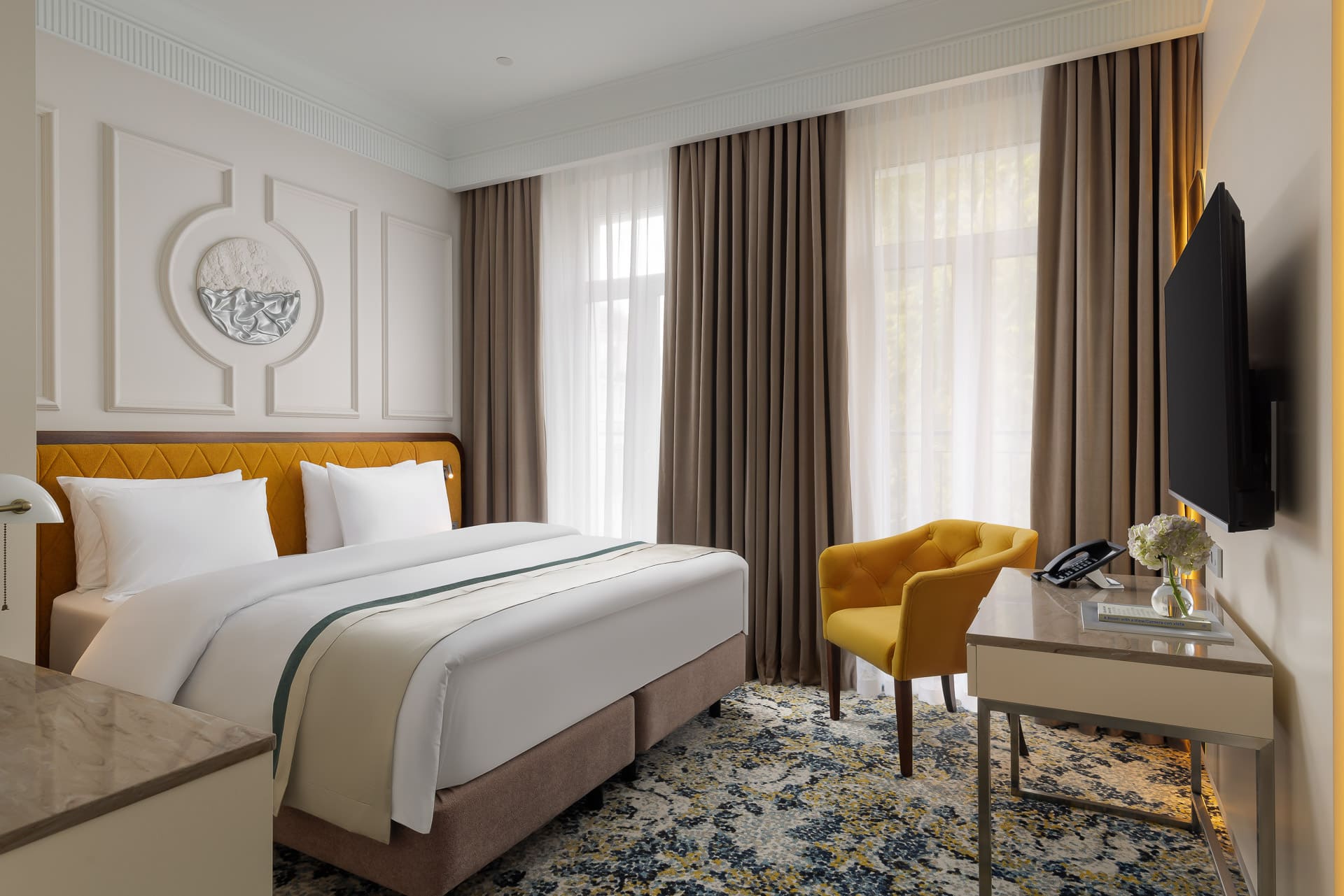 Интерьер выполнен в стиле современной классики. В каждом номере есть удобный рабочий стол, а также чайная и кофейная станции.